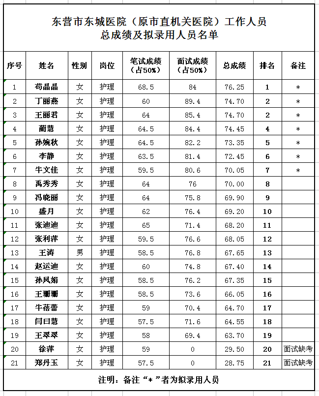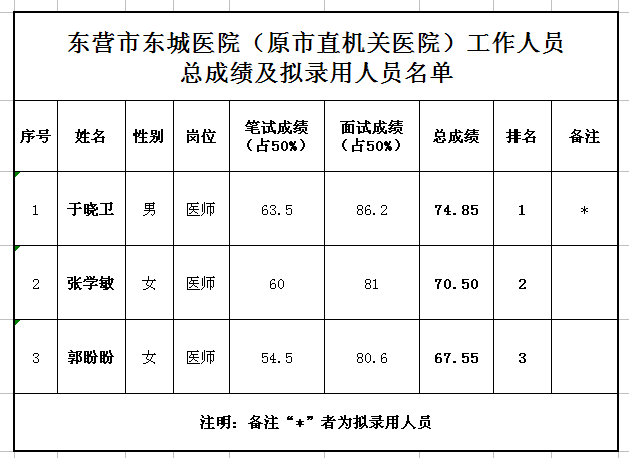 東營市東城醫(yī)院(原市直機關醫(yī)院)招聘工作人員總成績及擬錄用人員名單的通知