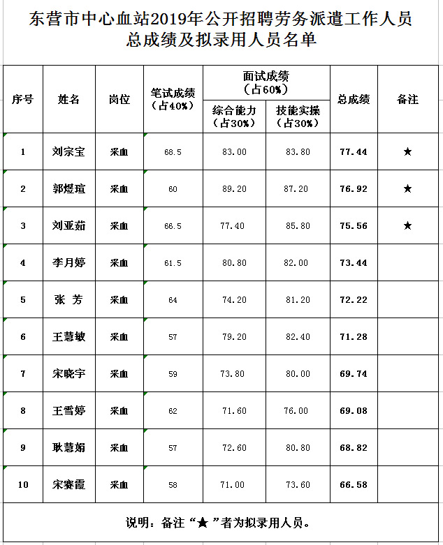 根據(jù)有關(guān)規(guī)定要求和本次招聘活動(dòng)的統(tǒng)一安排,現(xiàn)將《東營(yíng)市中心血站2019年公開招聘勞務(wù)派遣工作人員總成績(jī)及擬錄用人員名單》予以公布,請(qǐng)查閱。